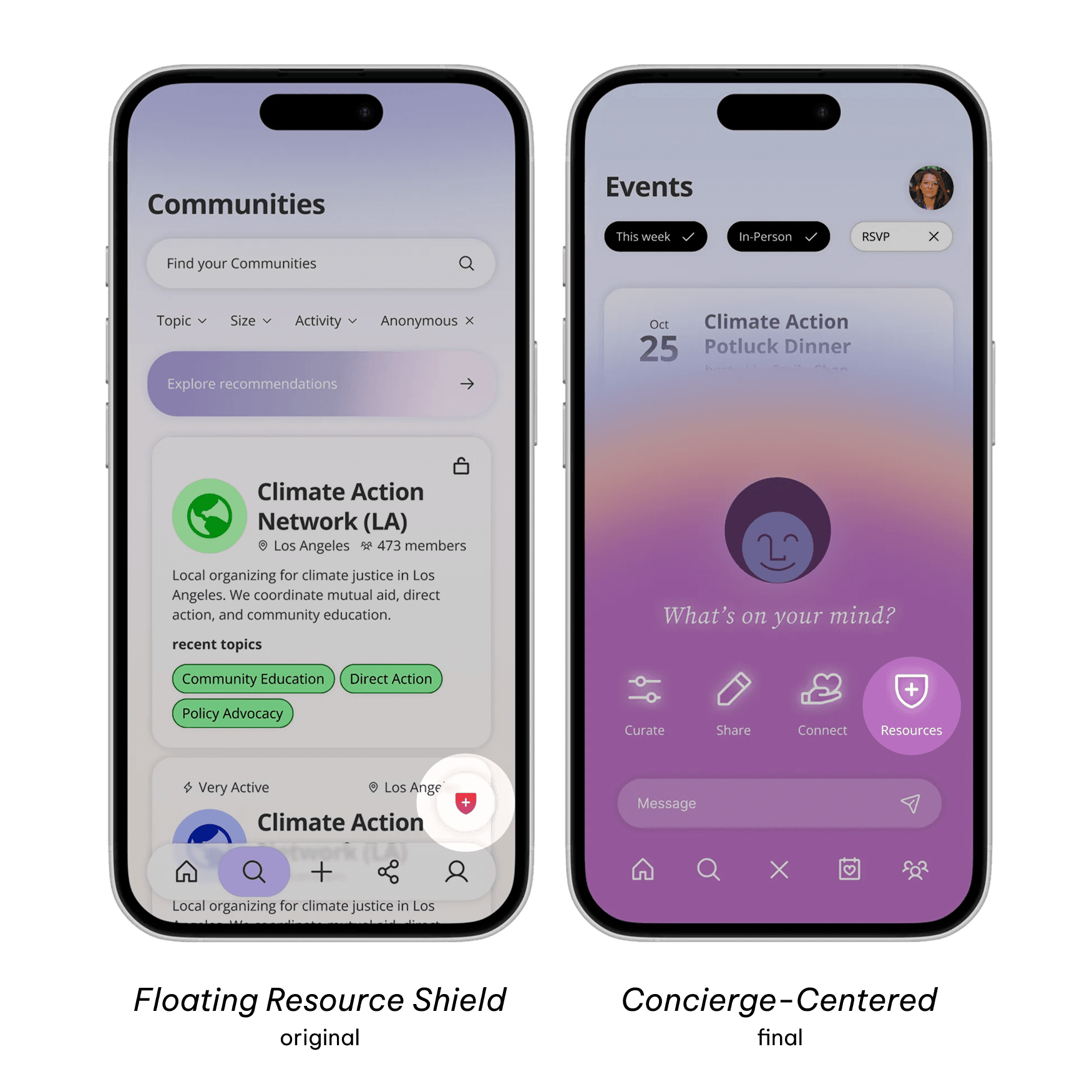 I consolidated everything into the concierge in the central navigation. "Resources" became a quick action that opens crisis support from this menu, and users can also simply begin sharing and get contextual help through conversation.