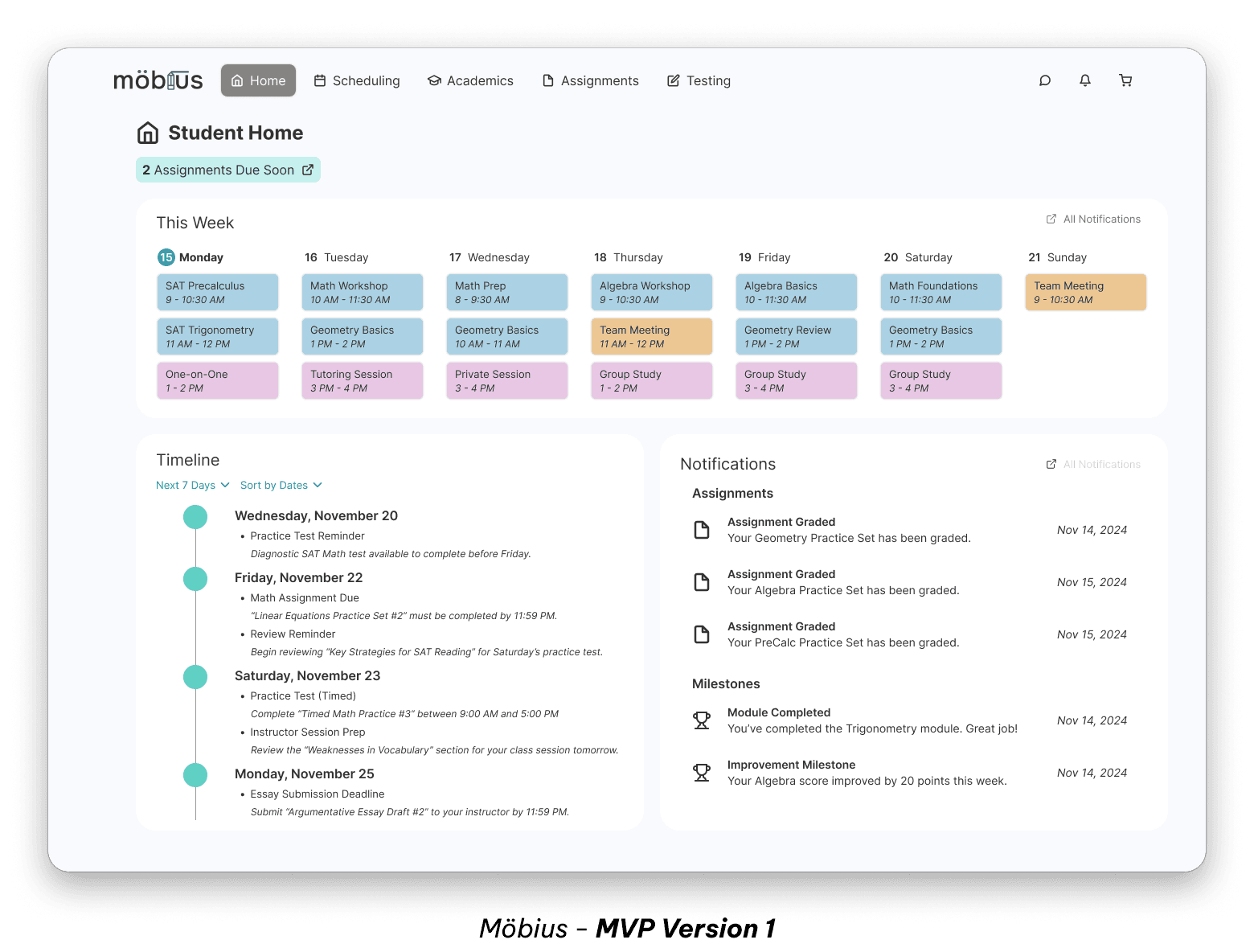 Delivered: Functional prototype of all core features: home, scheduling calendar, student progress tracking, assignment management, testing interface.